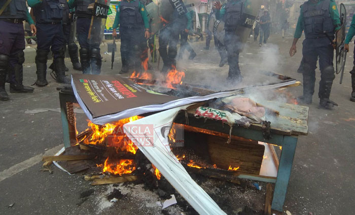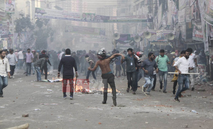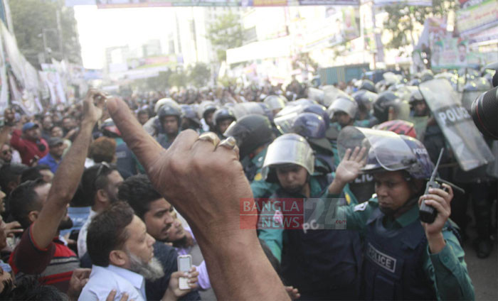 নয়া পল্টনের কেন্দ্রীয় কার্যালয়ের সামনে পুলিশের সঙ্গে বিএনপি নেতাকর্মীদের সংঘর্ষ। ছবি: ডিএইচ বাদল।