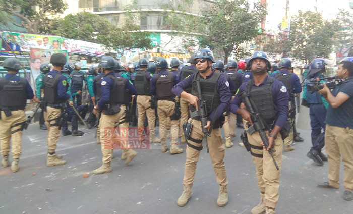 নয়াপল্টনে বিএনপি কার্যালয়ের সামনে আইনশৃঙ্খলা বাহিনীর অবস্থান। ছবি: আহমেদ শাকিল