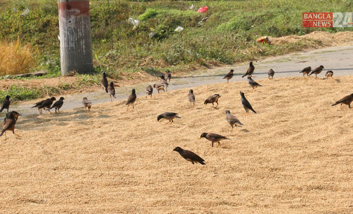 রোদে শুকাতে দেয়া ধানে শালিক পাখির বিচরণ। বরিশাল সদর উপজেলার লাকুটিয়া থেকে ছবিটি তুলেছেন এন আমিন রাসেল।