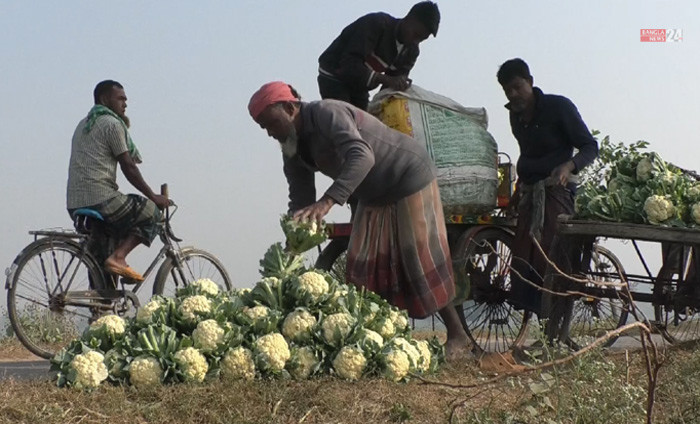ফুলকপি বাজারে নেওয়ার জন্য ভ্যানে তুলছেন কৃষক। ছবি: জিসান আহমেদ