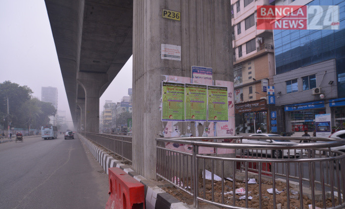 মেট্রোরেলের পিলারে এখনও পোস্টার দেখা যাচ্ছে। মিরপুর এলাকা থেকে ছবিটি তুলেছেন জি এম মুজিবুর।