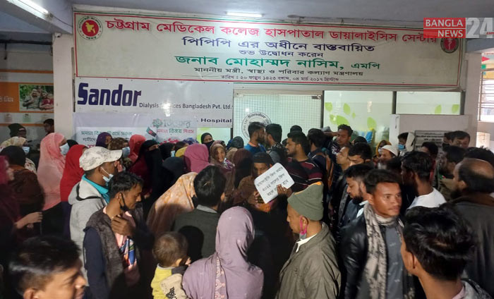 চট্টগ্রাম মেডিকেল কলেজ হাসপাতালে কিডনি রোগীদের ডায়ালাইসিস ফি বাড়ানোর প্রতিবাদে শনিবার বিকেলে বিক্ষোভ করেন রোগীর স্বজনরা। ছবি: উজ্জ্বল ধর