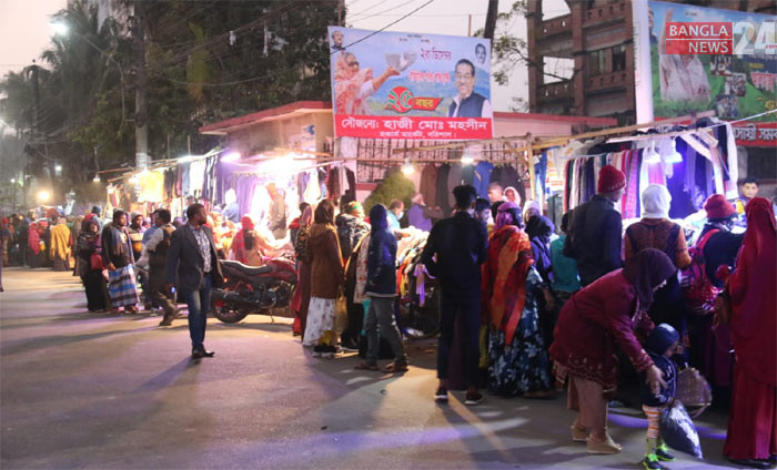 তীব্র ঠাণ্ডায় বরিশাল নগরীর ফুটপাতের দোকানগুলো বেড়েছে শীতবস্ত্র বেচাকেনা। ছবি: এন আমিন রাসেল