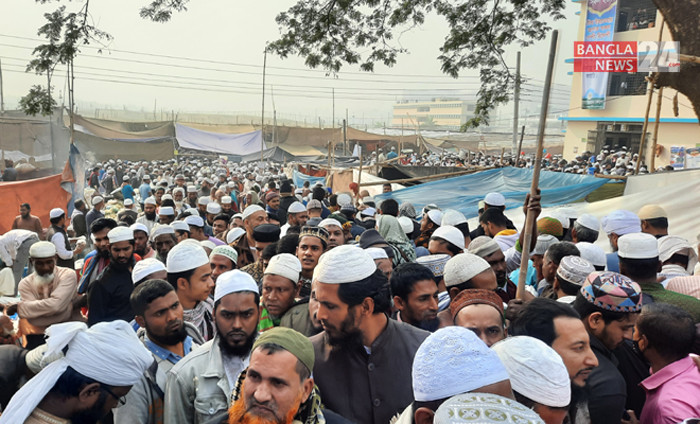 বিশ্ব ইজতেমায় জুমার নামাজ আদায়ের জন্য অপেক্ষারত মুসল্লিরা। ছবি: সাগর ফরাজী।