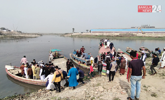 নৌকা যোগে বিশ্ব ইজতেমায় যাচ্ছেন মুসল্লিরা। ছবি: সাগর ফরাজী