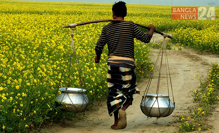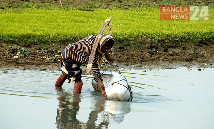 বিলের ডোবা থেকে পাতিলে পানি নিচ্ছেন কৃষক। পাবনার চর ভাঙ্গুড়া থেকে ছবিটি তু্লেছেন টিপু সুলতান।
