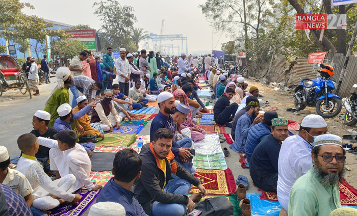 বিশ্ব ইজতেমার দ্বিতীয় পর্বে নামাজ আদায় করতে সড়কে মুসল্লিরা। ছবি: সাগর ফরাজী