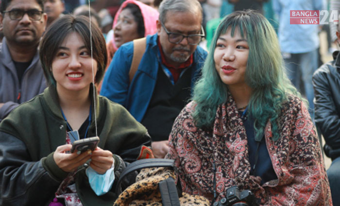 পিঠা মেলায় আগত বিদেশি দর্শনার্থীরা। ছবি ডিএইচ বাদল