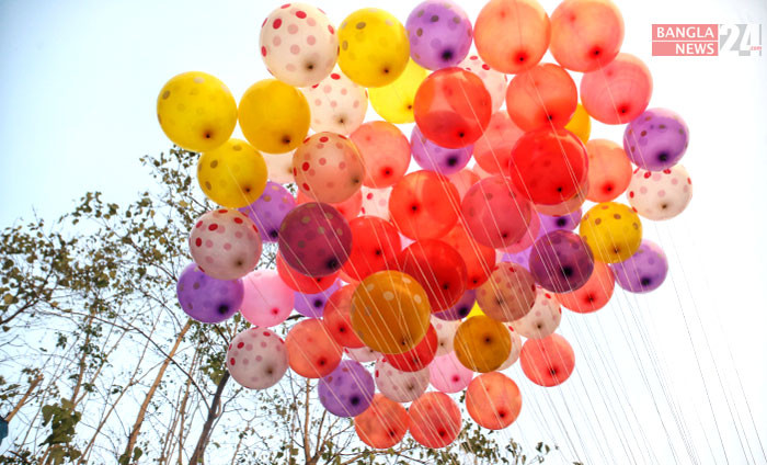নানা রঙয়ের বেলুন উড়িয়ে উদ্বোধন হয় মিঠা মেলার। ছবি ডিএইচ বাদল