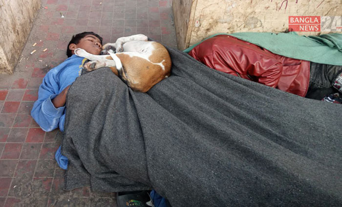 ফুটপাতে বেওয়ারিশ কুকুরকে নিয়ে ঘুমিয়ে আছে এক পথশিশু। ছবি: তৃষ্ণা