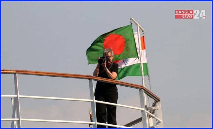 কীর্তনখোলায় নোঙ্গর করা প্রমোদতরী “গঙ্গা বিলাস” এর ছাদ থেকে ছবি তুলছেন এক পর্যটক। ছবি: এন আমিন রাসেল।