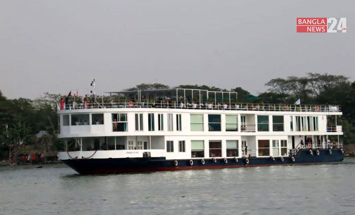 বিদেশি পর্যটকদের নিয়ে বরিশালের কীর্তনখোলা নদীতে ভারতের প্রমোদতরী গঙ্গাবিলাস। ছবি: এন আমিন রাসেল