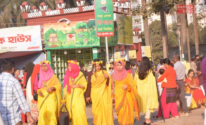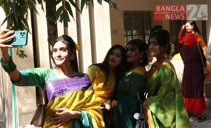 বাসন্তী রঙের শাড়ির সাজে তরুণীরা। ছবি: ডি এইচ বাদল