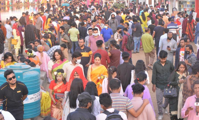 গাঁদাফুলের বাসন্তী রঙেই আজ সেজেছে তরুণ-তরুণীরা। ছবি: ডি এইচ বাদল