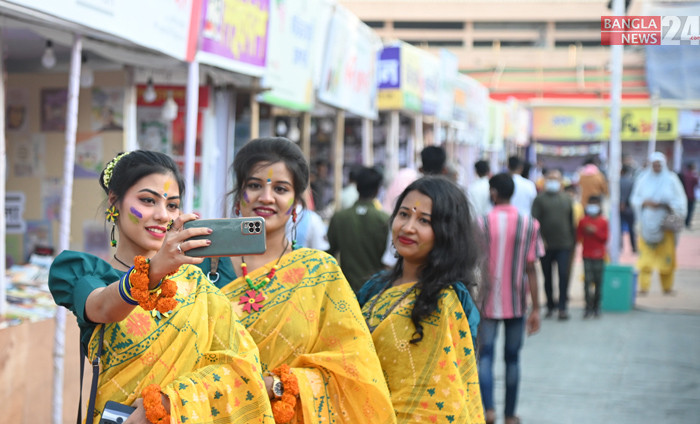 বসন্ত উৎসবে চট্টগ্রামের বইমেলায় সেলফি তোলায় মগ্ন তিন তরুণী। ছবি: উজ্জ্বল ধর