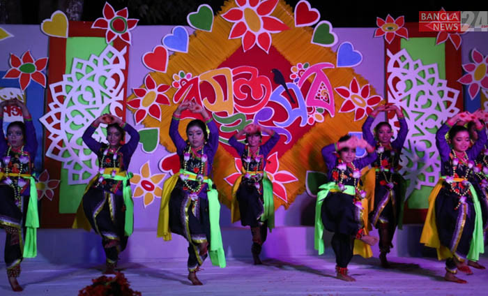 বসন্তবরণ উৎসবে মেতেছেন বরিশাল সরকারি মহিলা কলেজের শিক্ষার্থীরা। ছবি: এন আমিন রাসেল