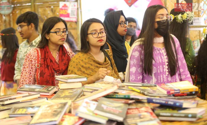 বিভিন্ন স্টল ঘুরে বই দেখছেন ও কিনছেন পাঠক ও দর্শনার্থীরা। অমর একুশে বইমেলা থেকে ছবিটি তুলেছেন ডিএইচ বাদল