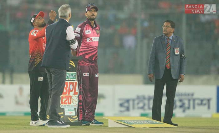 সিলেটের প্রথম ও কুমিল্লার চতুর্থ শিরোপা জয়ের হাতছানি। চলতি আসরের ফাইনালে টস করছেন অধিনায়কেরা। ছবি শোয়েব মিথুন
