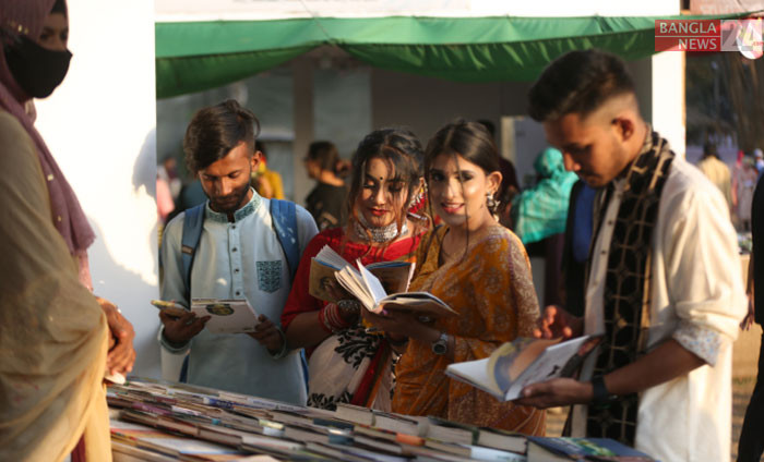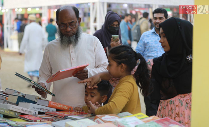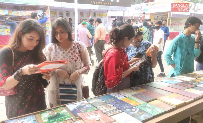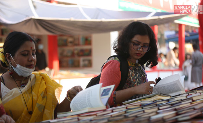 বইমেলায় বই দেখছেন পাঠকেরা। ছবি: ডিএইচ বাদল
