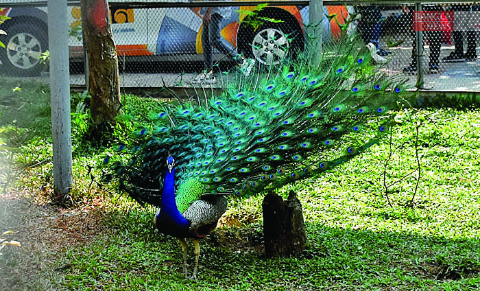 অসময়েই পেখম মেলল চট্টগ্রাম চিড়িয়াখানার ময়ূর। ছবি: উজ্জ্বল ধর