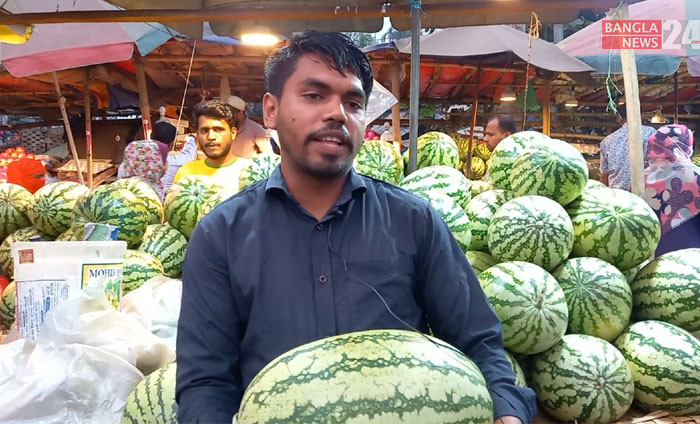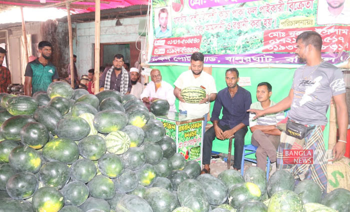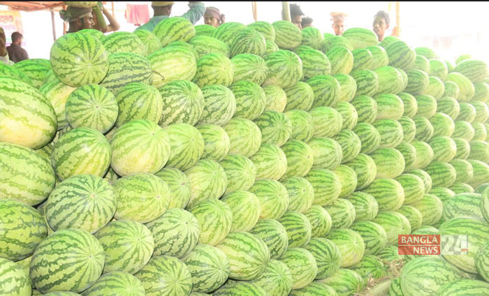 পাইকার বাজারে সাজিয়ে রাখা মৌসুমের রসালো ফল তরমুজ। ছবি: এন আমিন রাসেল।