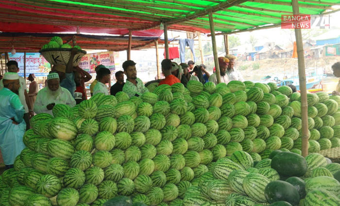 বরিশাল নগরের পোর্টরোডস্থ পাইকার বাজারে সাজিয়ে রাখা মৌসুমের রসালো ফল তরমুজ। ছবি: এন আমিন রাসেল।