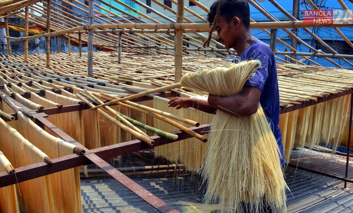 রোজা আর ঈদকে সামনে রেখে চট্টগ্রামের চাকতাই রাজাখালী এলাকায় বাড়ির ছাদে ছাদে সনাতনী পদ্ধতিতে তৈরি হচ্ছে বাংলা সেমাই। ছবি: উজ্জ্বল ধর