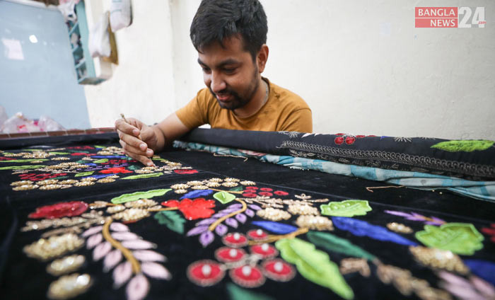 ঈদকে সামনে রেখে ব্যস্ততা পাঞ্জাবী, শেরোয়ান, লেহেঙ্গা, ওড়না, শাড়ি, বোরকায় জড়ি, চুমকি, কারচুপির কাজে ব্যস্ত চট্টগ্রামের আমবাগানস্থ বিহারি কলোনিতে বুটিক কাজে নিয়োজিত এমব্রডারি শ্রমিকরা। ছবি: উজ্জ্বল ধর