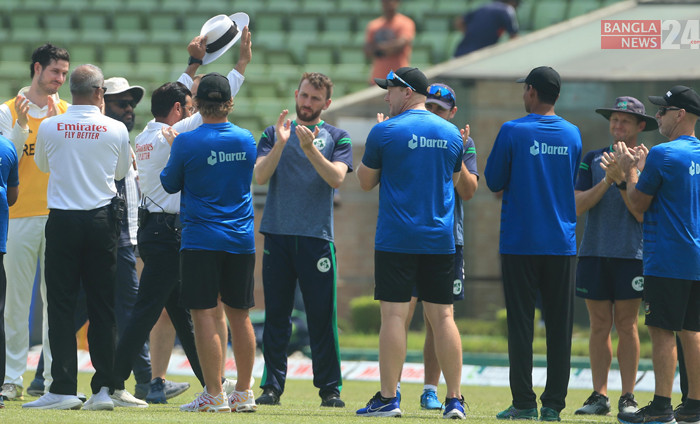 মিরপুরের শেরেবাংলায় আইরিশদের বিপক্ষে ঐতিহাসিক টেস্ট জয়ের পরক্ষণেই টেস্ট আম্পায়ারিংয়ে ইতি টানা আলিম দারকে গার্ড অব অনার দিলেন দুই দলের সদস্যরা। ছবি- শোয়েব মিথুন