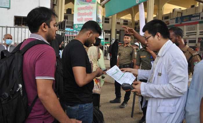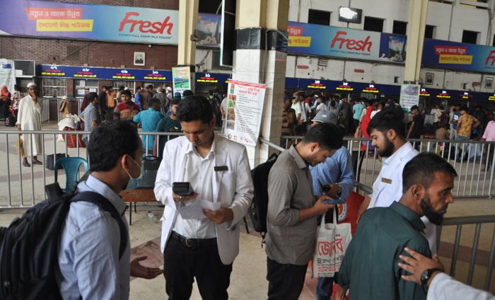 ঈদ যাত্রায় কমলাপুর রেল স্টেশনে ঢোকার আগে টিকেট চেক করা হচ্ছে। ছবি: শাকিল আহমেদ।