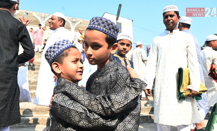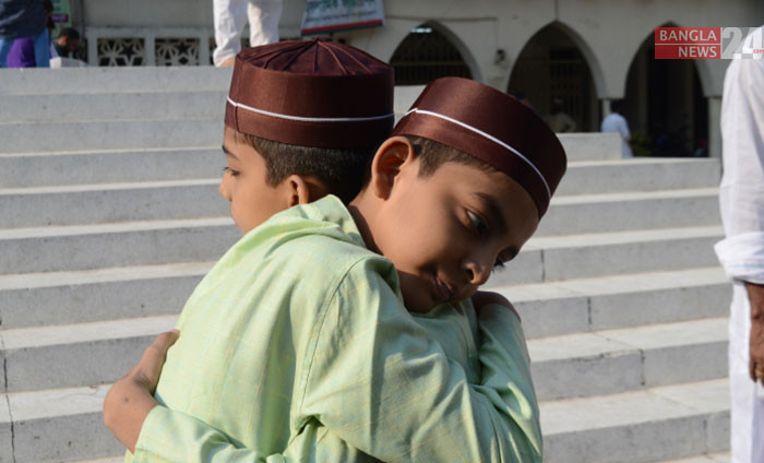 ঈদের নামাজ শেষে কোলাকুলি। ছবি : উজ্জ্বল ধর