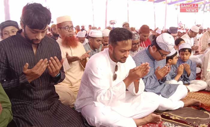 মাগুরার নোমানী ময়দানে ঈদের নামাজ আদায় করেন জাতীয় ক্রিকেট দলের টেস্ট ও টি-টোয়েন্টি অধিনায়ক সাকিব আল হাসান। ছবি: জয়ন্ত জোয়াদ্দার