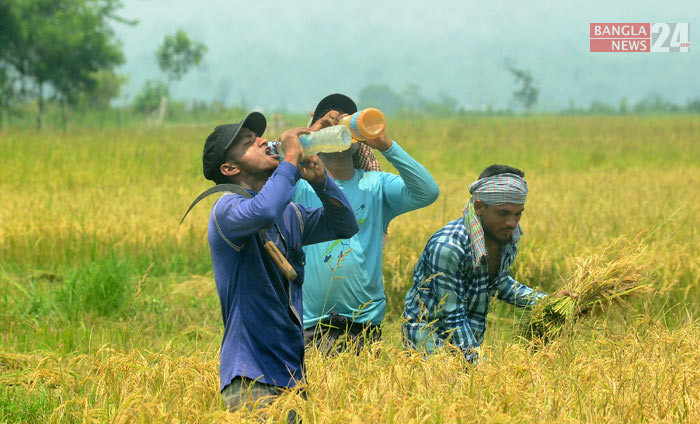 ধান শুকানোর কাজে ব্যস্ত কৃষাণ ও কৃষাণী। ছবি: আরিফ জাহান