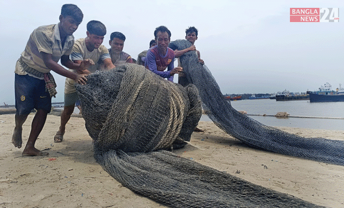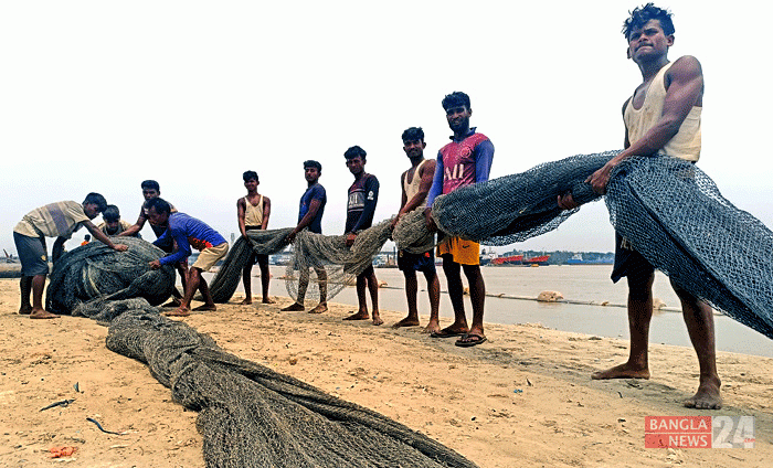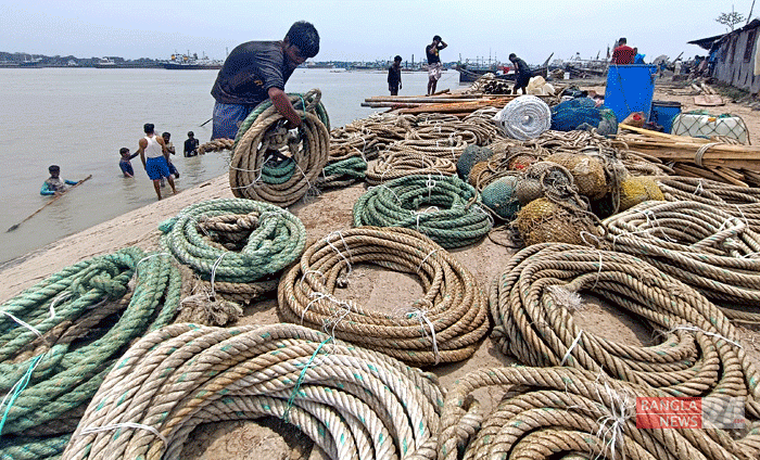 ৬৫ দিনের জন্য সাগরে মাছ ধরা নিষেধাজ্ঞার প্রথম দিনে চট্টগ্রামের কর্ণফুলি নদীর নতুন ফিসারিঘাট এলাকায় জেলেরা নিজেদের জাল গুছিয়ে নিচ্ছে। ছবি: উজ্জ্বল ধর