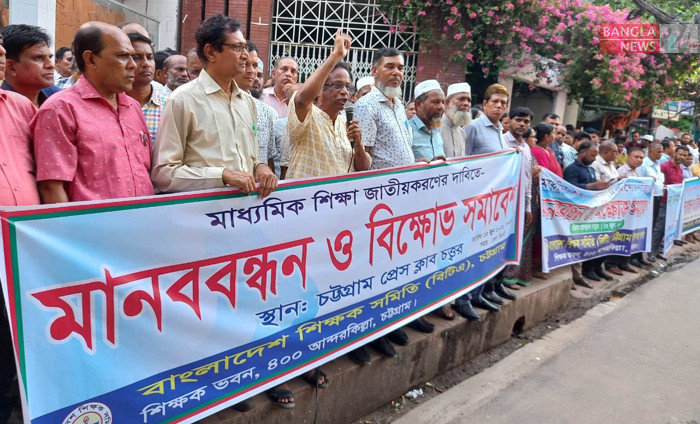 মাধ্যমিক শিক্ষা জাতীয়করণের দাবিতে মঙ্গলবার বিকেলে চট্টগ্রাম প্রেসক্লাবের সামনে মানববন্ধন ও সমাবেশ করে বেসরকারি মাধ্যমিক স্কুলের শিক্ষকরা। ছবি: উজ্জ্বল ধর
