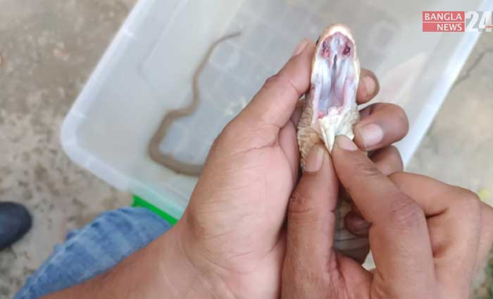 ‘পদ্ম-গোখরা’র বিষদাঁত দুটি তুলে ফেলে হয়েছে। ছবি: বাংলানিউজ