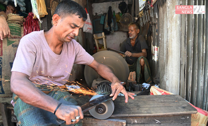 কোরবানির পশু জবাই-কাটাছেঁড়া করতে দা-ছুরি-কিরিচ ধারানোর কাজে ব্যস্ত চট্টগ্রামের জেলরোড এলাকার শানের দোকানগুলো, ছবি: উজ্জ্বল ধর