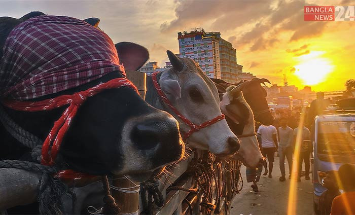 পশুর হাটে বিক্রির জন্য আনা হচ্ছে কোরবানির গরু। ছবি: শোয়েব মিথুন