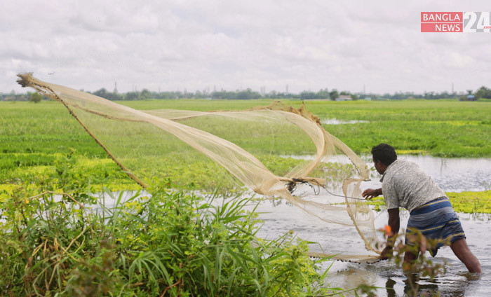 জাল দিয়ে মাছ ধরছেন এক জেলে। ছবি: রাজীন চৌধুরী