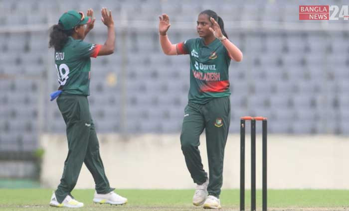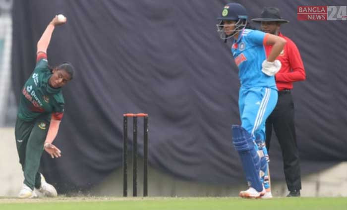 মিরপুরের শেরে বাংলা জাতীয় ক্রিকেট স্টেডিয়ামে তিন ম্যাচ ওয়ানডে সিরিজের প্রথমটিতে ভারতকে ৪০ রানে হারিয়েছে বাংলাদেশের মেয়েরা। ছবি: শোয়েব মিথুন