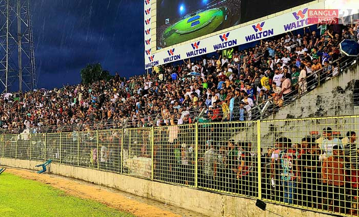 মাঠে বৃষ্টি গ্যালারিতে বসে উল্লাস করছে ক্রিকেটপ্রমীরা। ছবি: মাহমুদ হোসেন