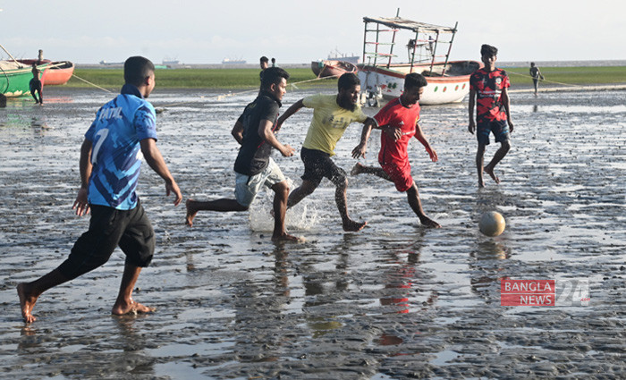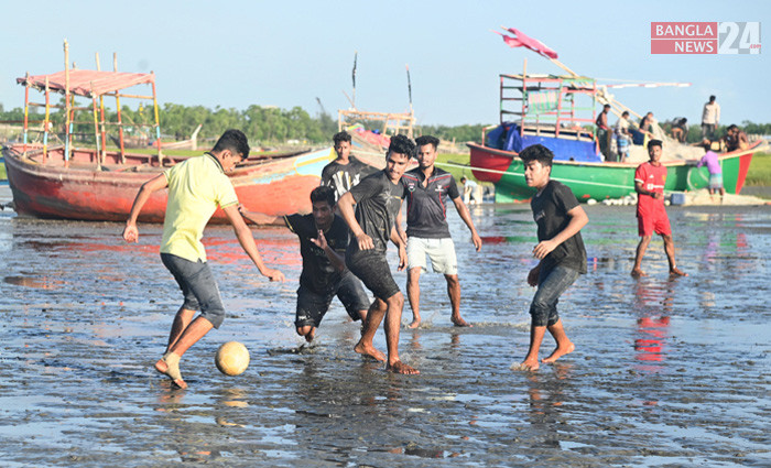 পেশায় এরা কেউ সাগরে মাছ ধরে আবার কেউ জেলে পরিবারের সন্তান। ভাটার সময় তীরে জেগে ওঠা চরে দল বেঁধে ফুটবল খেলছেন তারা। চট্টগ্রামের দক্ষিণ কাট্টলী সমুদ্র সৈকত এলাকা থেকে ছবিটি তুলেছেন উজ্জ্বল ধর।