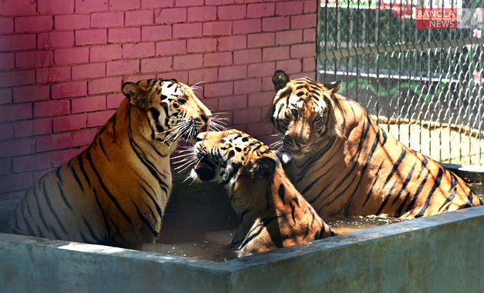 চট্টগ্রাম চিড়িয়াখানায় ছোট ট্যাংকের পানিতে গাদাগাদি করে শরীর ঠাণ্ডা করছে তিন বাঘ। ছবি: উজ্জ্বল ধর