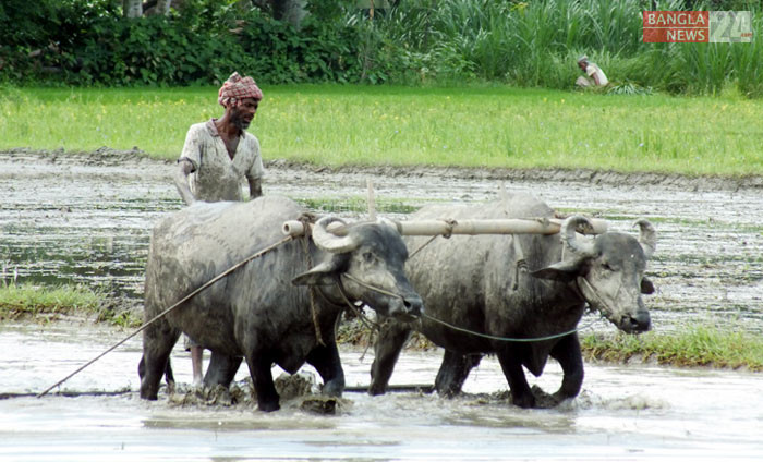 জোড়া মহিষ আর মই দিয়ে জমি সমান্তরাল করছেন কৃষক। ঈশ্বরদীর মুলাডুলি ইউনিয়নের বাঘহাছলা গ্রাম থেকে ছবি তুলেছেন টিপু সুলতান