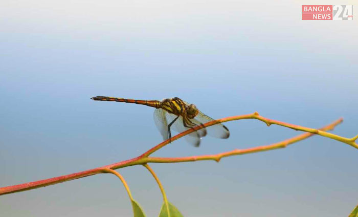 গাছের ডালে বসে আছে ফড়িং। সিলেটের শাহজালাল উপশহর থেকে ছবি তুলেছেন মাহমুদ হোসেন