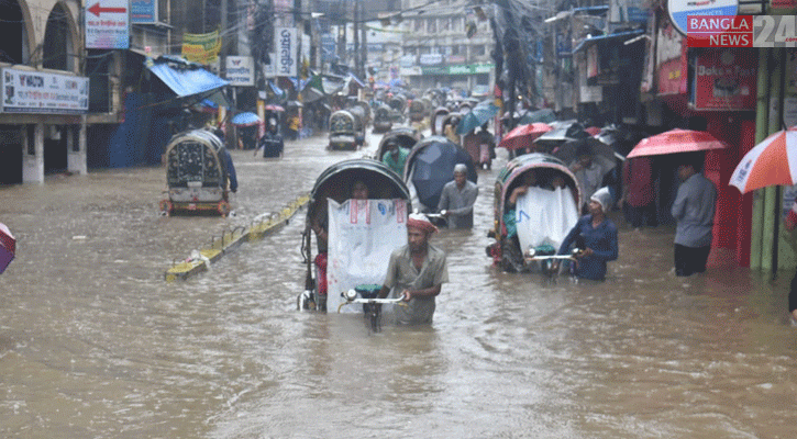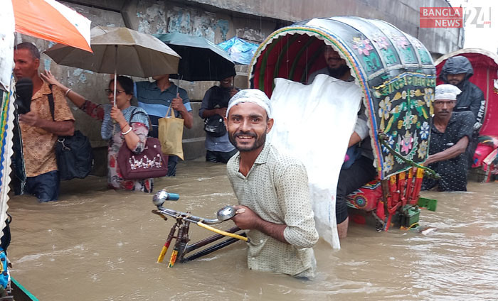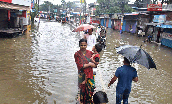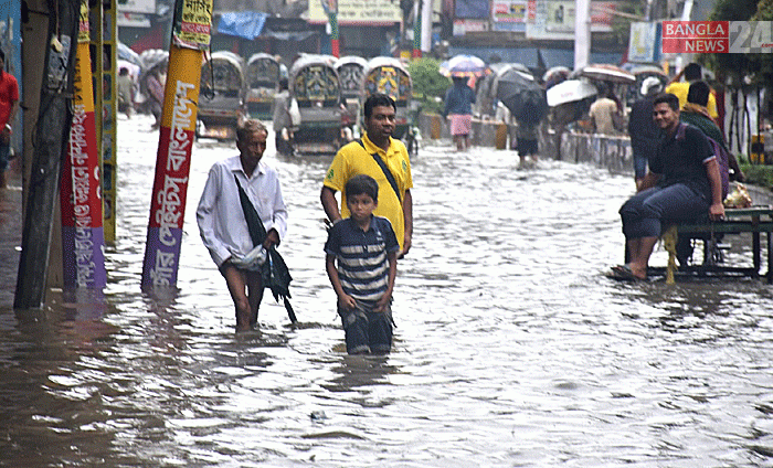 টানা বর্ষণে তলিয়ে গেছে চট্টগ্রামের অধিকাংশ এলাকা, নালা ও খালের নোংরা বিষাক্ত কালো পানি মাড়িয়ে চলাচল করছেন পথচারীরা। ছবি: উজ্জ্বল ধর