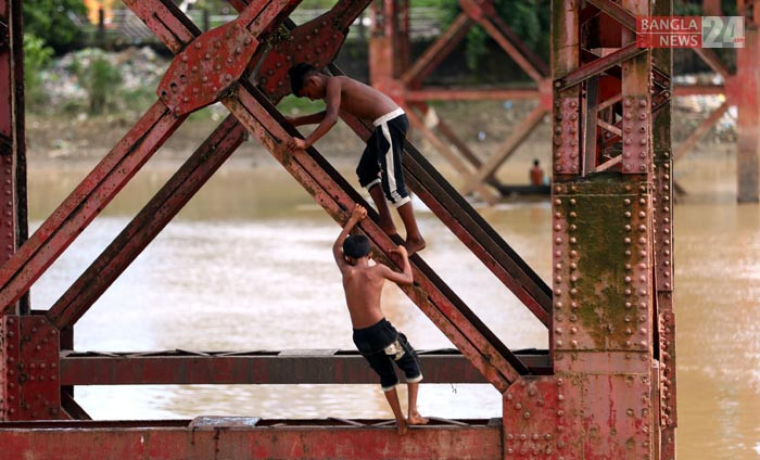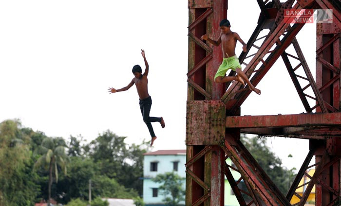 সিলেটের ঐতিহ্যবাহী কিনব্রিজ থেকে লাফিয়ে সুরমা নদীতে পড়ছে দুরন্ত শিশুরা। তবে এমন দুরন্তপনা বেশ ঝুঁকির। ছবি: মাহমুদ হোসেন।