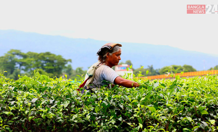 বাগানে চা-পাতা তুলছেন এক শ্রমিক। ছবি: মাহমুদ হোসেন