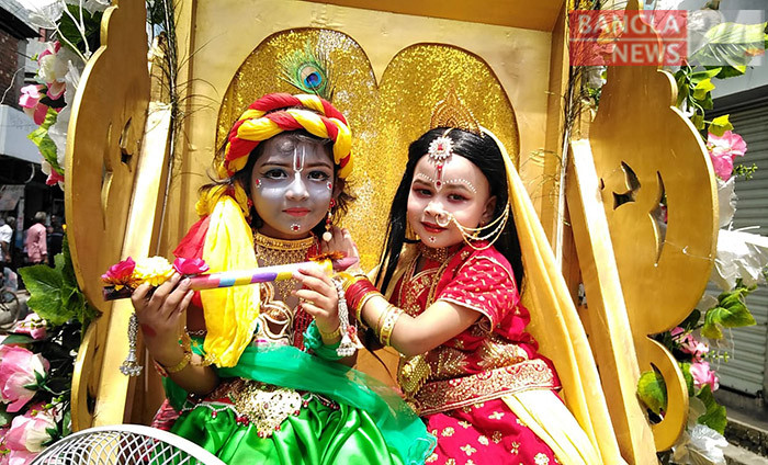 জন্মাষ্টমী উপলক্ষে বরিশাল নগরে করা র্যালিতে রাধাকৃষ্ণ সেজে দুই শিশুর অংশগ্রহণ। ছবি: এন আমিন রাসেল