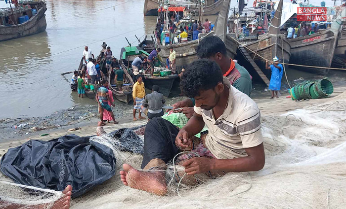 সাগর থেকে ইলিশ আহরণ শেষে বন্দরে ফিরে জাল বুনছেন জেলে। চট্টগ্রামের ফিশারিঘাট থেকে ছবিটি তুলেছেন সোহেল সরওয়ার